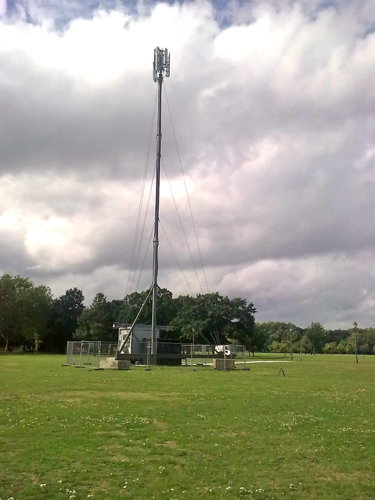 Clearly, this very amateur photo was taken before tonight’s deluge, but it has still managed to create a storm of its own. It’s an O2 mobile phone mast. Dumped in the middle of Victoria Park, less than a minute’s walk from a toddlers’ playground.