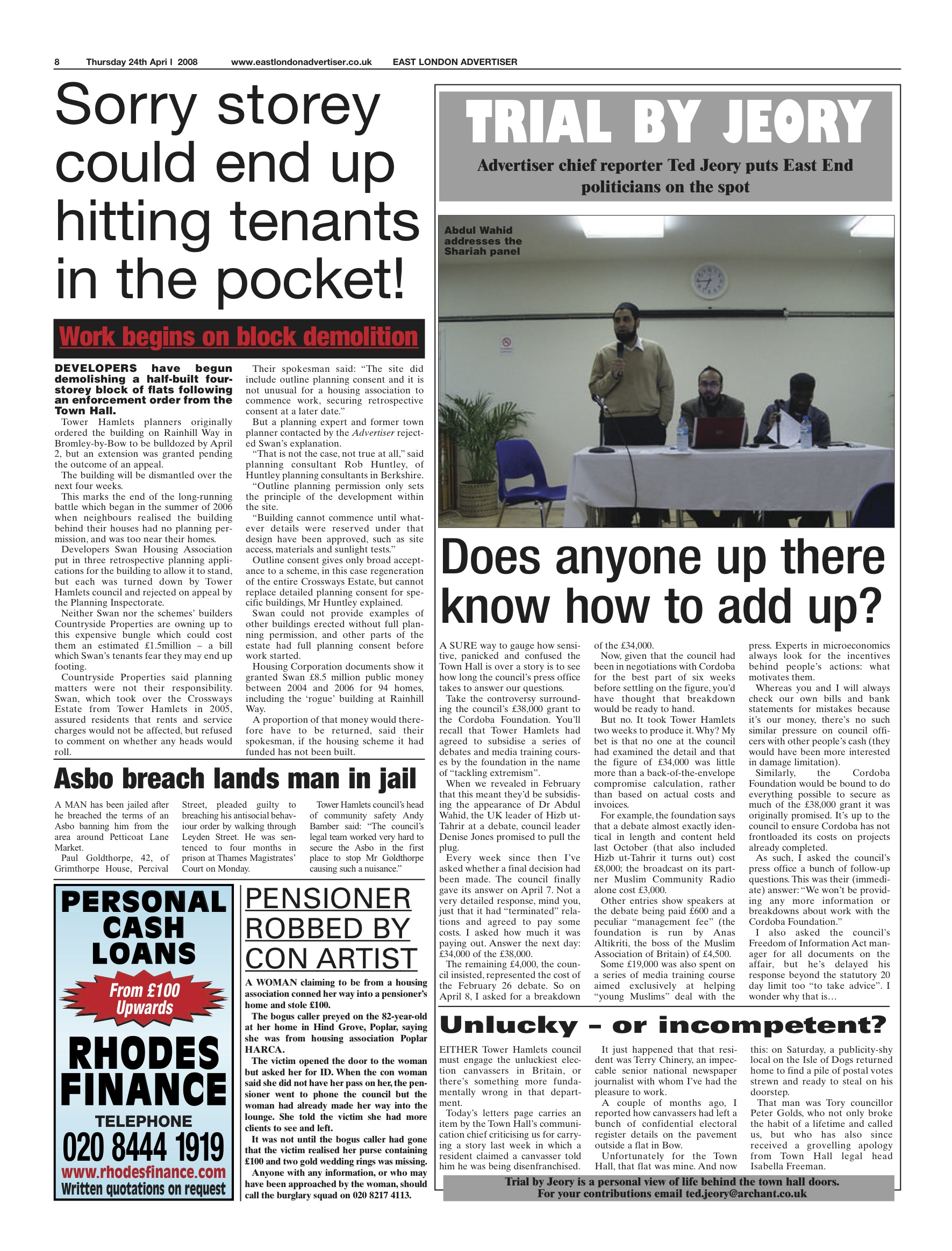 I’ll be blunt: I don’t trust the Cordoba Foundation. I first came across them in February 2008 when I broke the story (subsequently raised in the Commons here that Tower Hamlets Council had allocated the organisation, which is headed by Anas Al-Tikriti, £38,000 of Government Preventing Violent Extremism money to fund a debate including Hizb ut-Tahrir. The debate at the London Muslim Centre was legitimate enough – whether Muslims should participate in democracy (the audience overwhelming said no) – but council leaders agreed that using money to pay HT speakers was not exactly appropriate. After I told the council about the guest list, they said they would withhold some of the £38k. After several weeks of deliberation and obvious collusion with the Foundation, the grand sum of £4,000 was kept back. I wrote about it in the East London Advertiser here: