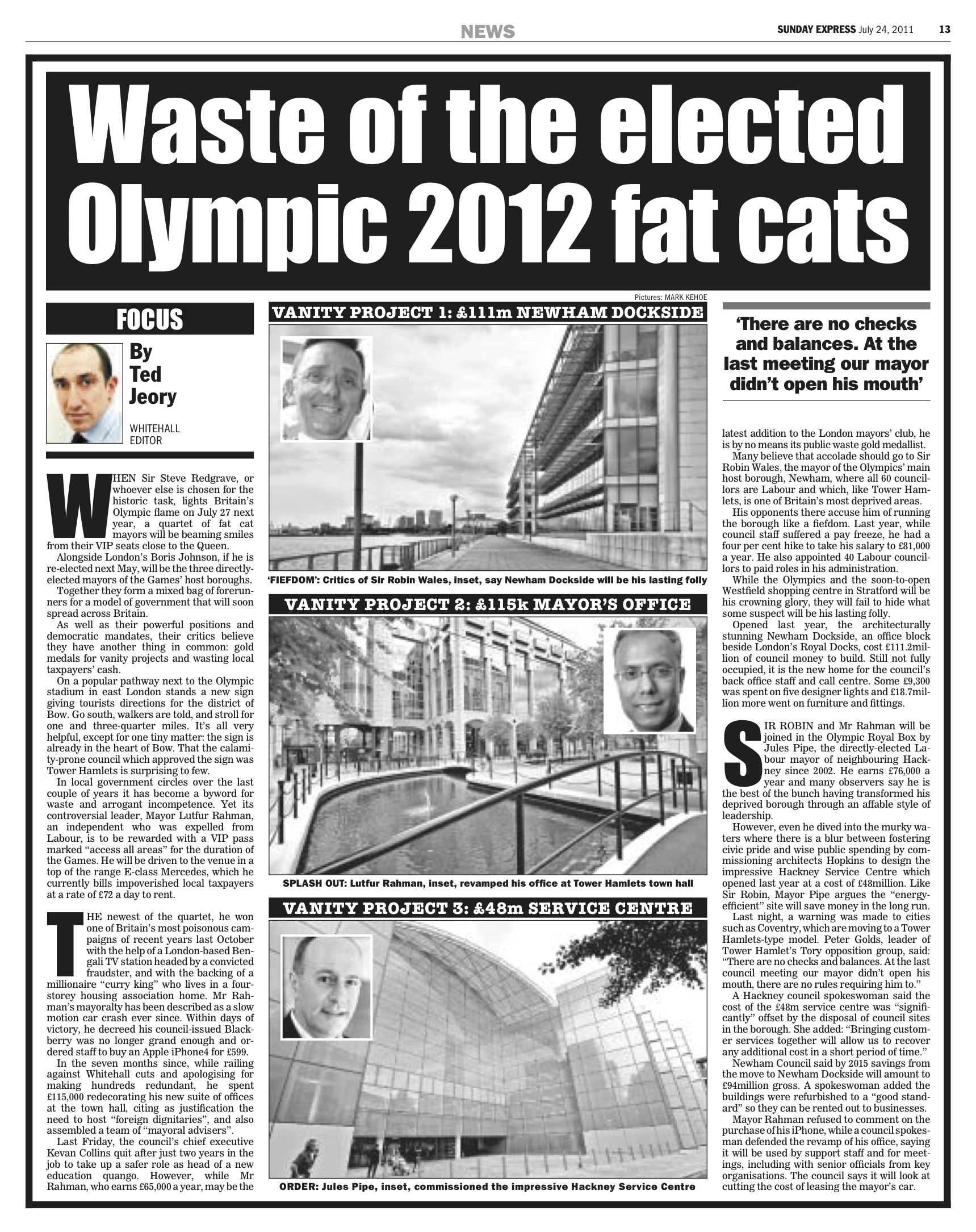 If you’ve ever been to the sumptuous Newham Dockside office complex by the Royal Docks, or passed by the architecturally brilliant Hackney Service Centre in Hillman Street, or marvelled at Lutfur Rahman’s spending on desks and filing cabinets, then you might be interested in this piece I wrote for today’s Sunday Express.