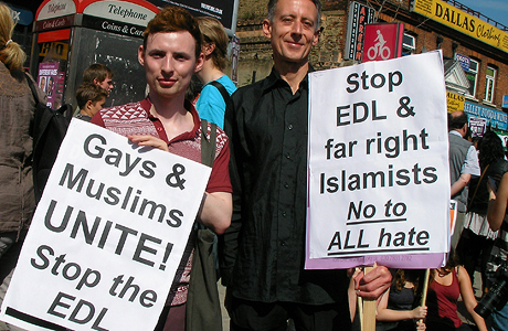 To these ends, my human rights campaign colleague Ashley McAlister and I joined the anti-EDL protest, carrying double-sided placards which read on one side: “Stop EDL & far right Islamists. No to ALL hate” and on the other side: “Gays & Muslims UNITE! Stop the EDL”.
