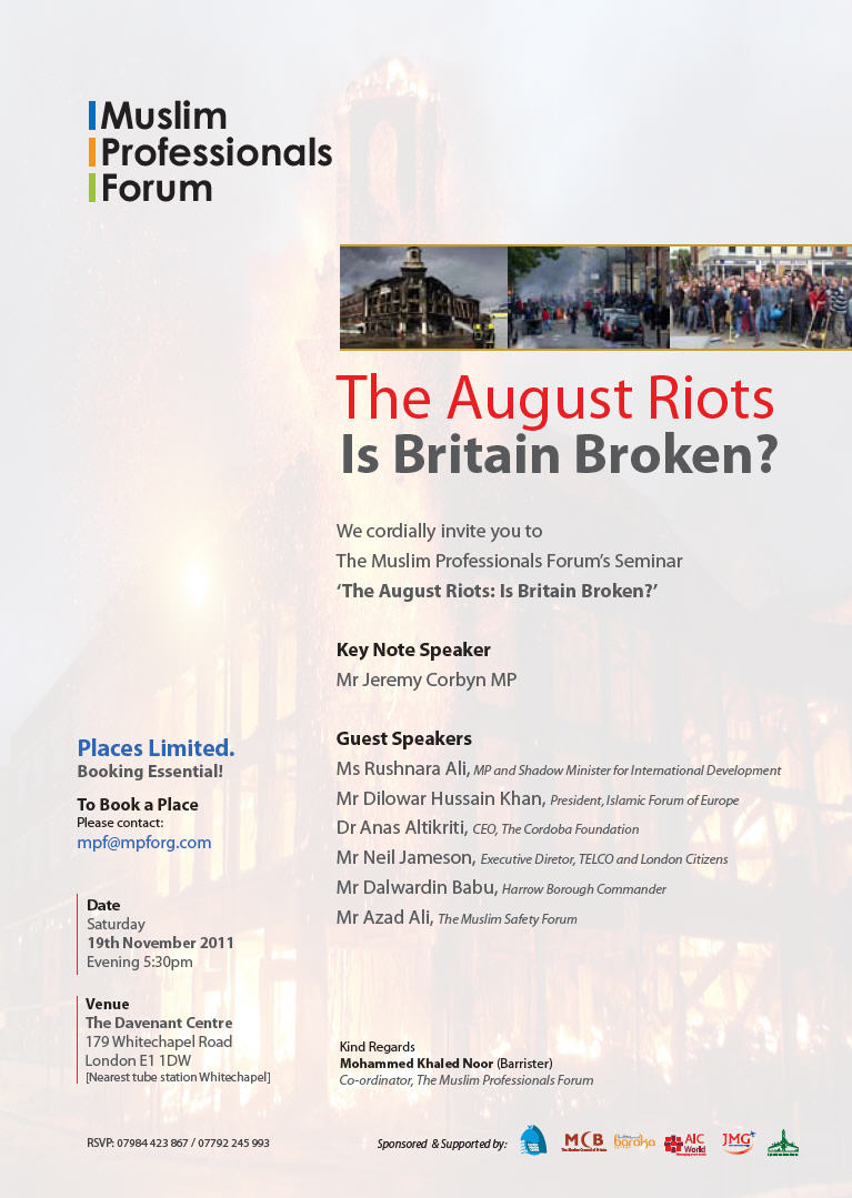 Note the name Interpal. On November 19th, this forum will be staging a debate entitled, The August Riots: Is Britain Broken? It will be held at the Davenant Centre in Whitechapel. Here's the poster for the event:![]()