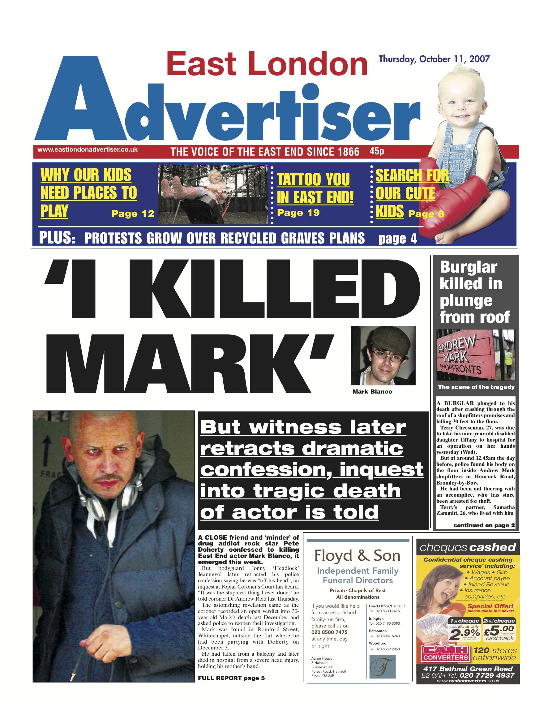 The second was published in October 2007, the day after a coroner halted an inquest into Mark’s death and dismissed out of hand the conclusions of a shockingly shoddy police investigation conducted in Tower Hamlets that suggested Mark had either killed himself or died as a result of an unexplained accident. At that inquest, Johnny Jeannevol – better known to his friends on Exmouth Estate in Stepney as Johnny Headlock, the diminutive hard-nut “minder” to Libertines frontman Peter Doherty – admitted he had confessed to murdering Mark by single-handedly throwing the bulky 6ft 4ins Cambridge graduate over the first floor railings…only later to retract his words.