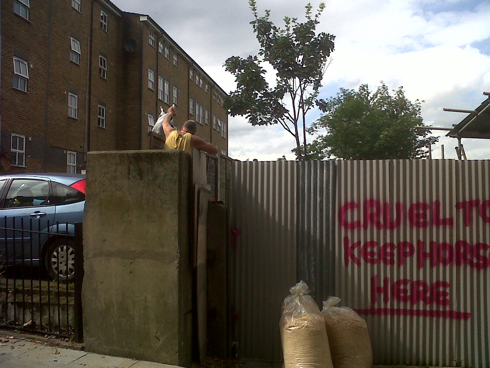 He then tried opening his padlocks to the makeshift “stables” but couldn’t because they’d been glued. That’s why he had to climb over. He then looked rattled when I started asking more questions, such as whether he had planning permission (“Yes, I’ve got all the permissions I need).