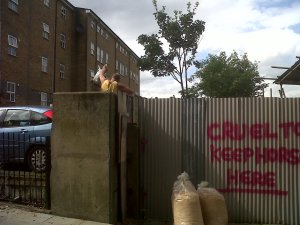 As I stopped to have a look, a man in a yellow T-shirt arrived (he’s the man climbing over the fence in the first picture). I asked him what the graffiti was all about. Bloody animal rights, he said. “Cruel, my arse. Where do they expect horses to be kept?”