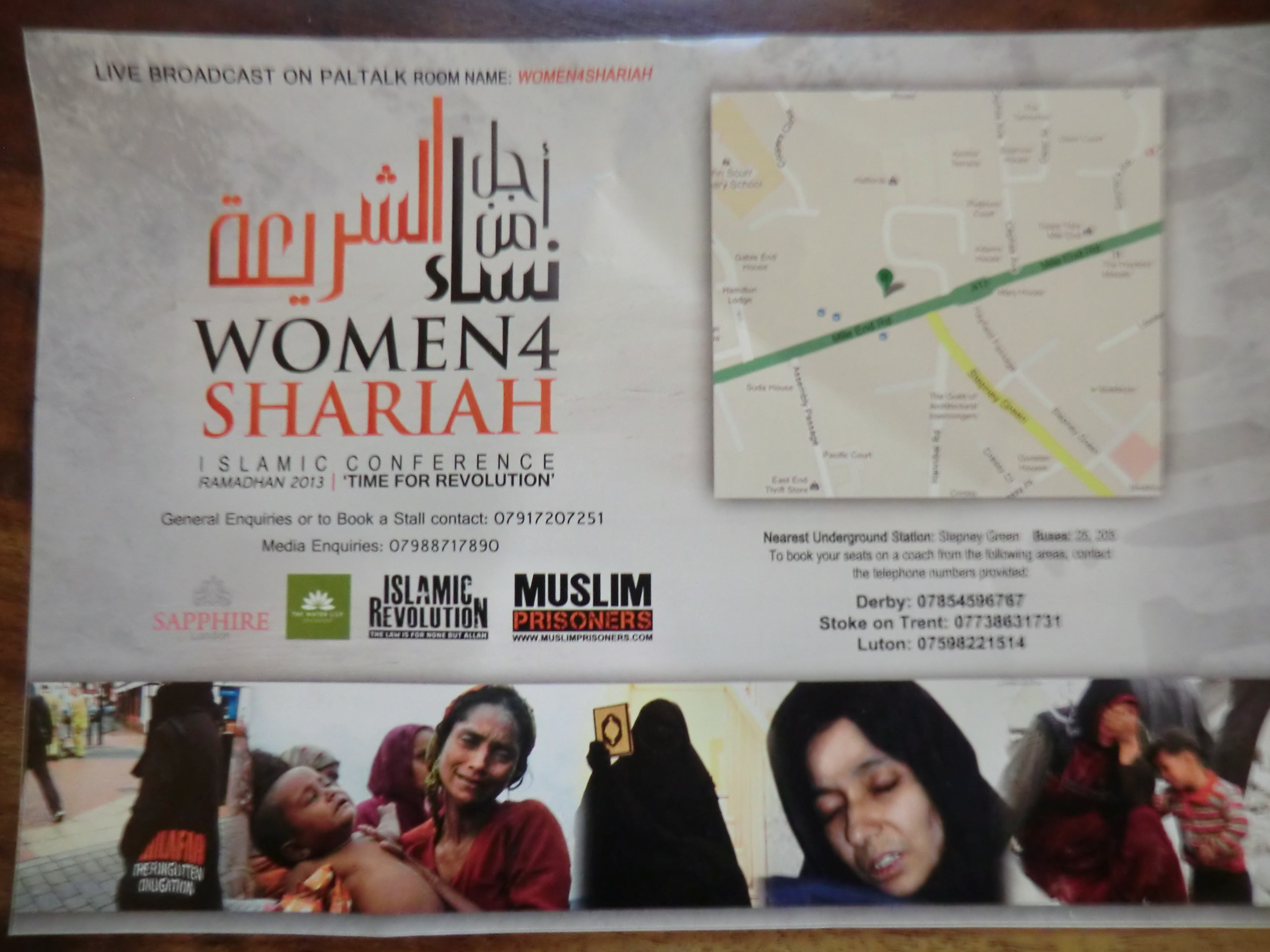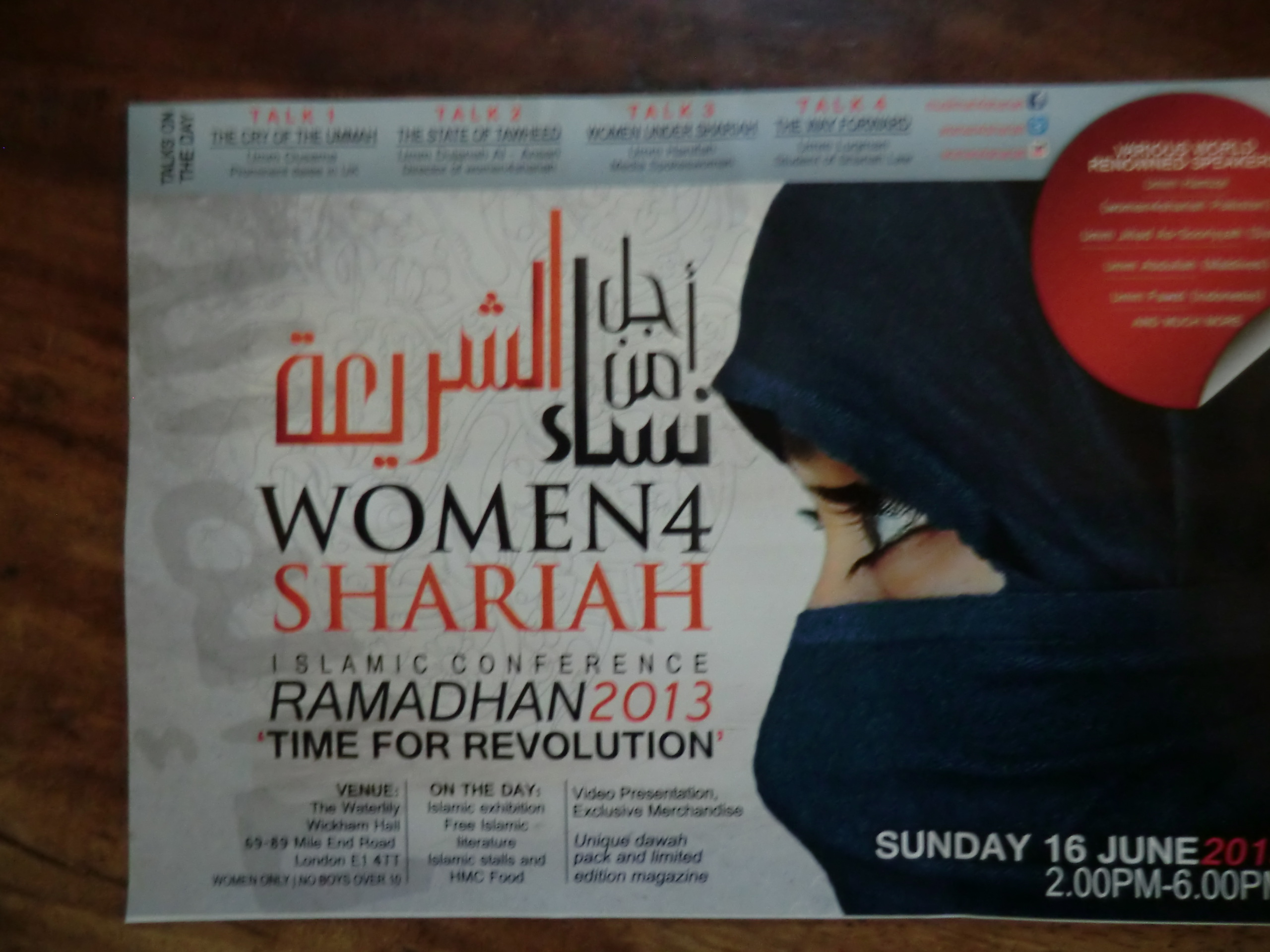I’m not sure he had anything to do with the leaflets on his counter. They were also in the New Road store, where the workers were described by another visitor as looking like “hard core Salafis”. The leaflets were from a group called Women4Shariah, which is heavily linked to Anjem. And it is having a conference next month at that well known venue for extremism, the Water Lily in Mile End Road, at which the theme will be “Time for Revolution.”