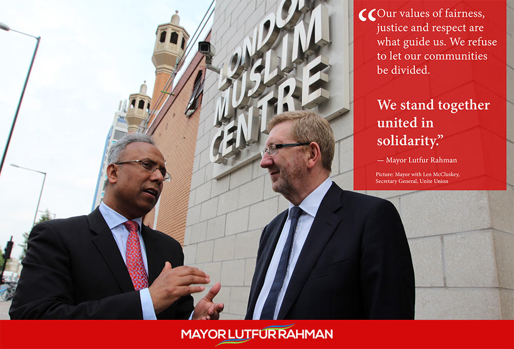 The leaflet is clearly aimed only at Bengali people. The photos in it are only of Bengali people and I presume it was posted quite selectively, only to Bengali households. The photos with “Red Len” are outside the London Muslim Centre. All this obvious racial bias and then they say they’re working to stop the EDL threat? What EDL threat? Last I saw two men, just two, attempted to walk peacefully up Whitechapel Rd and were themselves violently assaulted before being arrested. How is this an EDL “threat”? It seems to me that this is a racially biased election campaign using the fear of a non existent threat (let’s call it “Anglophobia”) and efforts on the part of people like this Len of suspended disbelief. Or maybe he’s just a treasonous enemy of the state.