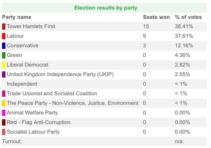 However, Lutfur is very pleased by how the council is shaping up. Forty-two seats were up for grabs last night (the three from Blackwall and Cubitt Town will be elected about early July).