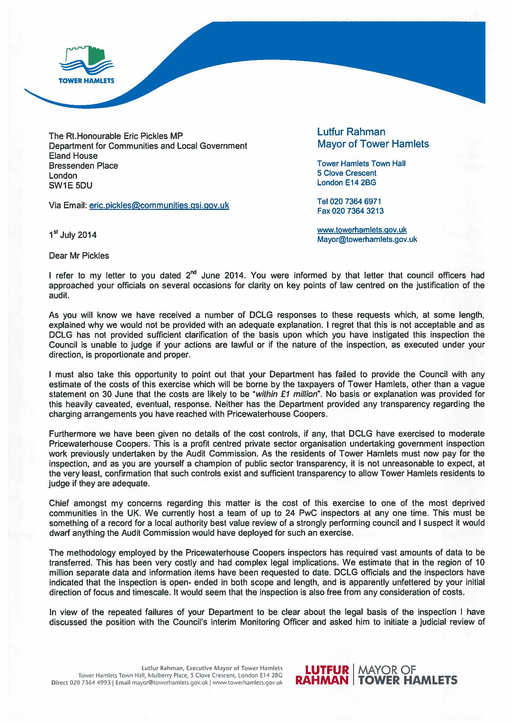 The full judgment, extending the injunction until Jan 31 2016, is here. I also recommend bookmarking it: it is characterised by a certain degree of scepticism regarding the origin of Lutfur’s legal fund.
