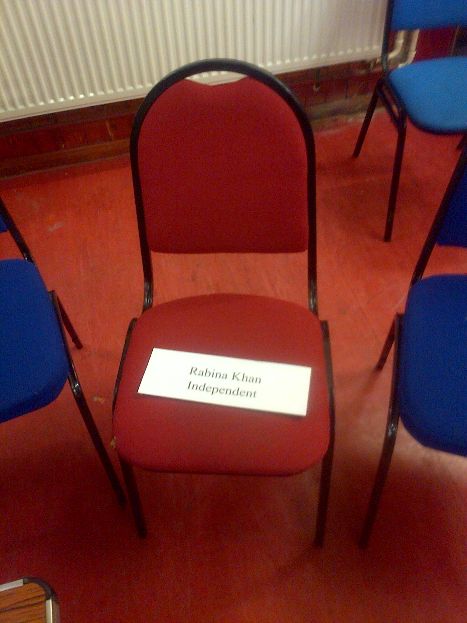 Meanwhile, Rabina yet again failed to attend a hustings last night, this time on the Isle of Dogs. Here’s the seat that was reserved for her: